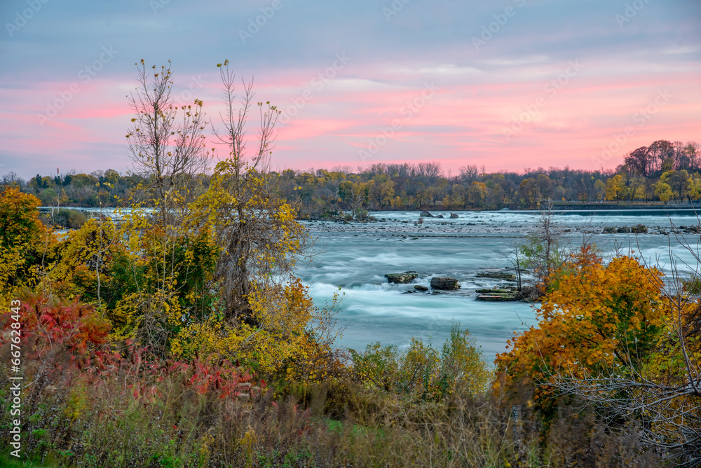 Fall foliage at Brother Island, Horseshoe Falls viewpoint to Old power house building. Canada, Niagara Falls State Park at sunset, long exposure fast flowing waterfall cascade