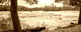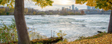 Panorama bright yellow fall foliage autumn leaves from Goat Island, upstream Niagara Falls with downtown Niagara Falls City, Canada in background at sunset, fast flowing waterfall cascade