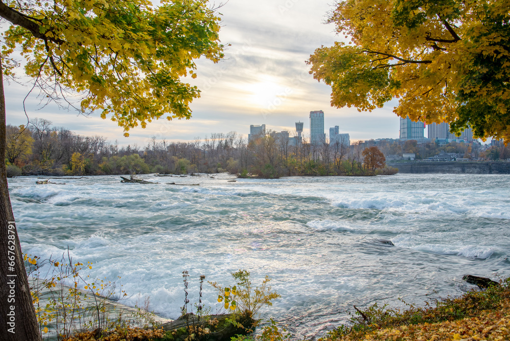 Bright yellow fall foliage autumn leaves from Goat Island, upstream Niagara Falls with downtown Niagara Falls City, Canada in background at sunset, fast flowing waterfall cascade