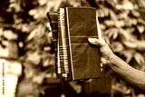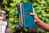 Folded Cotton Fabric Lungi hand holding with Green Blurry Background. Traditional Men's Fashion Lifestyle in Bangladesh
