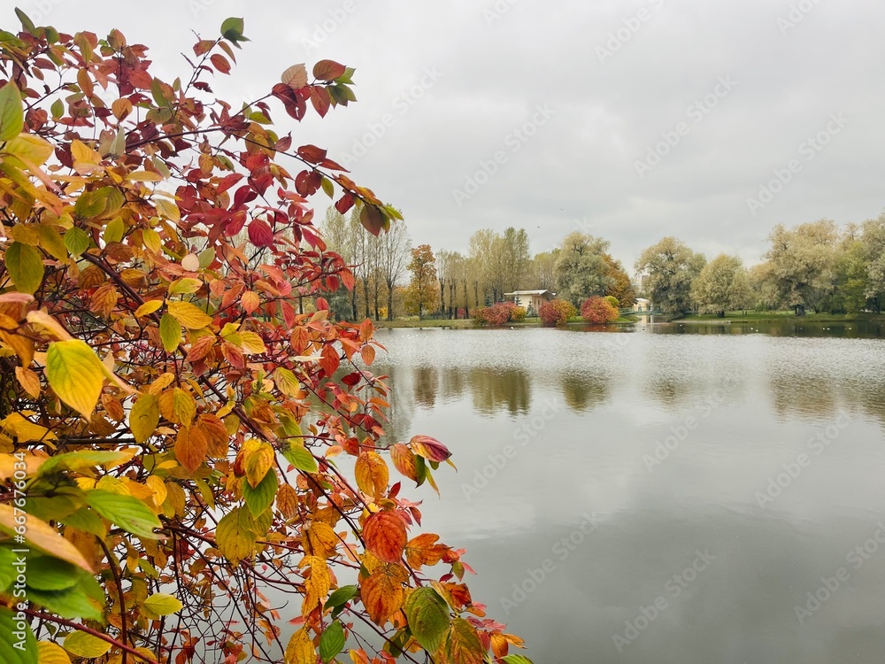 autumn trees reflection on the pond surface in the park, cloudy weather