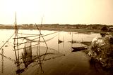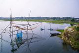 Beautiful Landscape view of a Traditional Fishing net Vessel with a Wooden Boat in the river in Bangladesh
