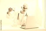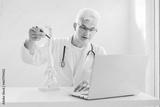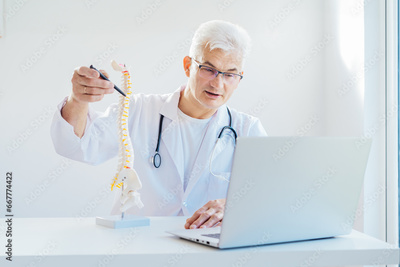 Doctor using laptop for telemedicine with patient at hospital. Osteopath makes online video call consult, pointing on human spine model. Spinal healthcare and back pain treatment. Remote appointment