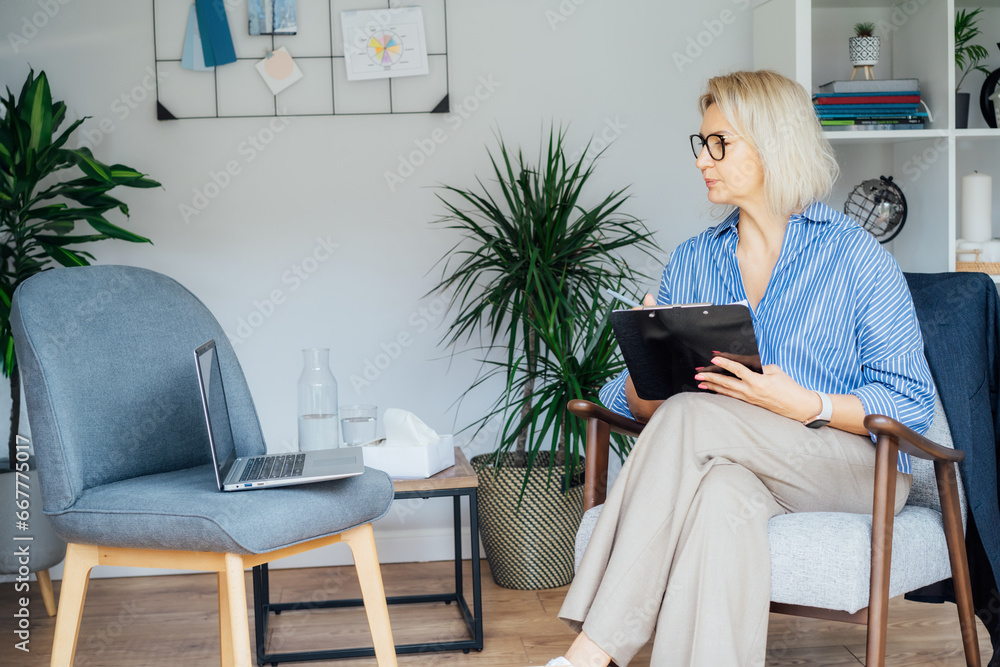 Professional Psychotherapy online. Middle aged female Psychologist having video call consultation on laptop while sitting on armchair In office. Specialist talking, counseling, helping patient online