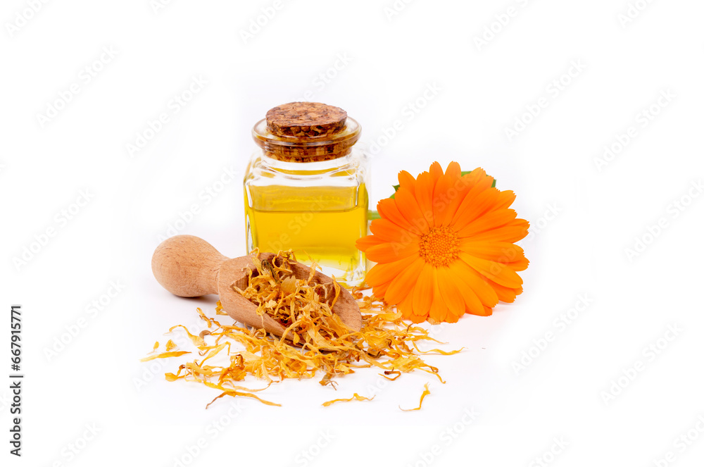 Herbal calendula officinalis in the glass and drop oil Isolated