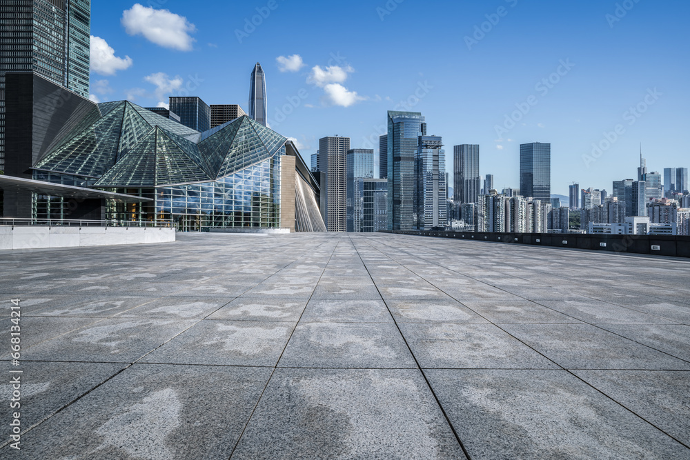 City square and skyline with modern buildings scenery in Shenzhen, Guangdong Province, China.