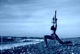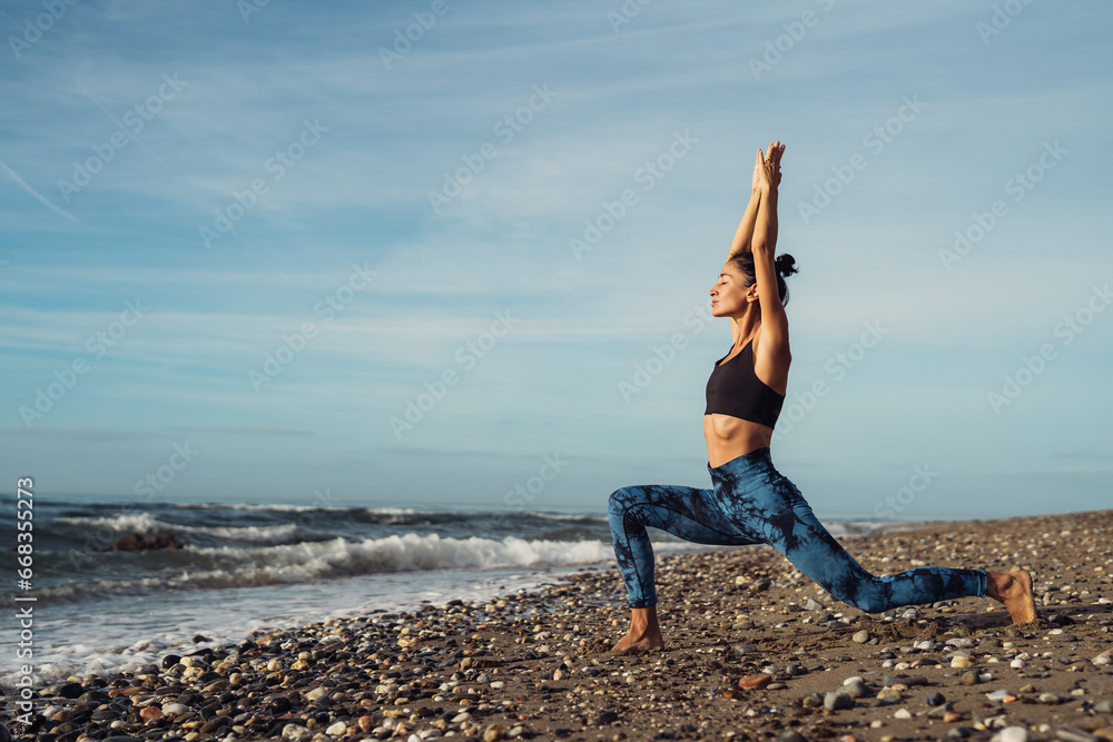 Beautiful athletic brunette girl doing Pilates by the seaside