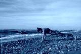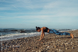 Beautiful athletic brunette girl doing Pilates by the seaside