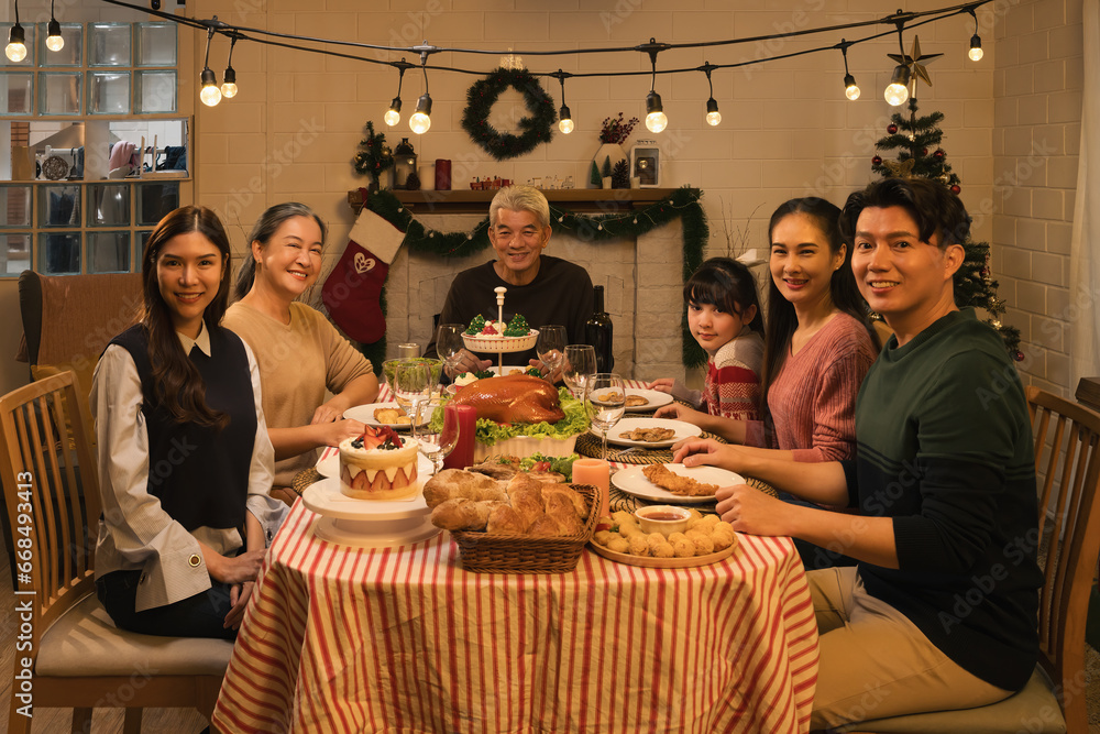 happiness Asian family with multi generation together on thanksgiving and Christmas celebration traditional dinner at home