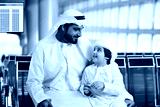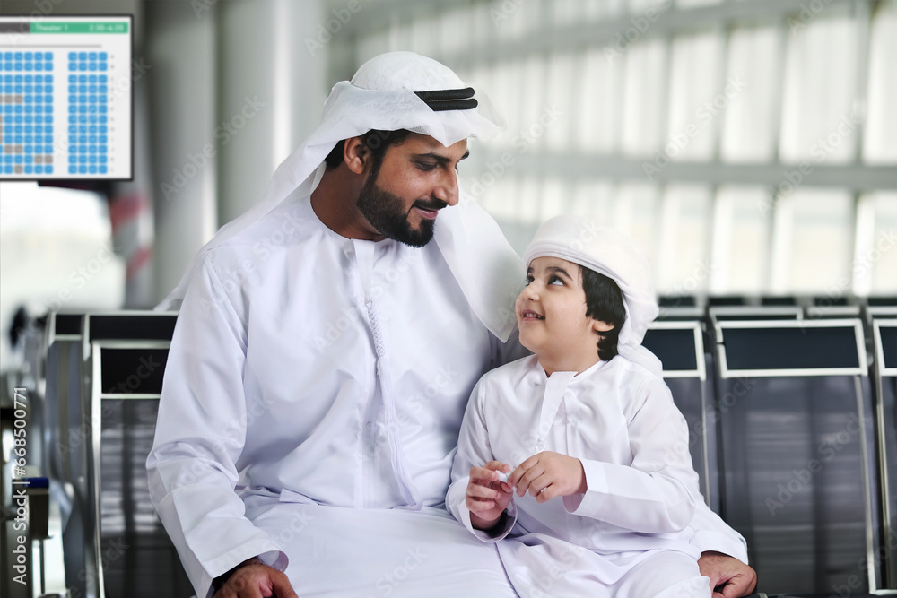 Middle Eastern Arab family father and son at airport travelling for holiday season concept. Arabic Emirati national flying overseas