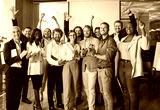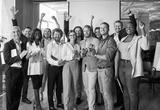 Portrait of diverse excited happy business people standing in office applauding and looking cheerful at the camera. Group of coworkers men and women smiling indoors. Team work concept.
