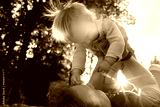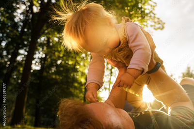 Father plays with a cute blonde baby toddler in the park at sunset, dad lifts the baby up in his arms. The concept of a happy childhood, a strong family. Sun rays with selective focus