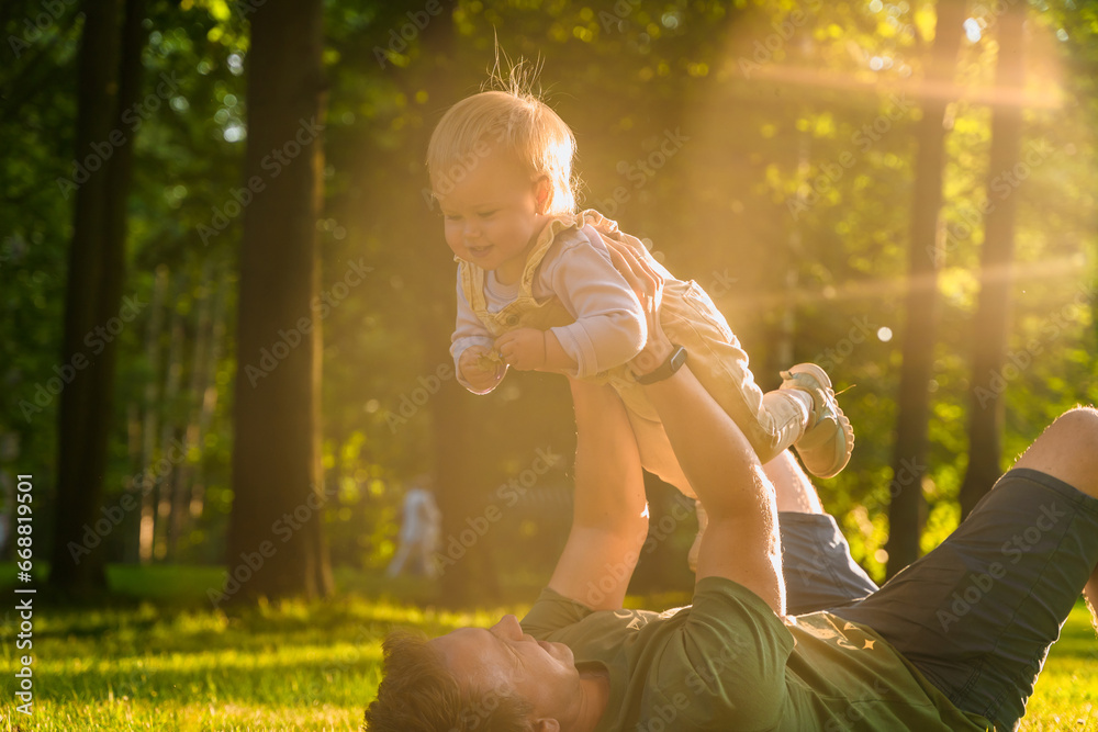 Father plays with a cute blonde baby toddler in the park at sunset, dad lifts the baby up in his arms. The concept of a happy childhood, a strong family. Sun rays with selective focus