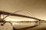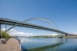 Large arched truss two-story transport Fremont Bridge over the full-flowing Willamette River in Portland Oregon