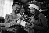Happy woman opens gift box from her boyfriend on Christmas day at home.