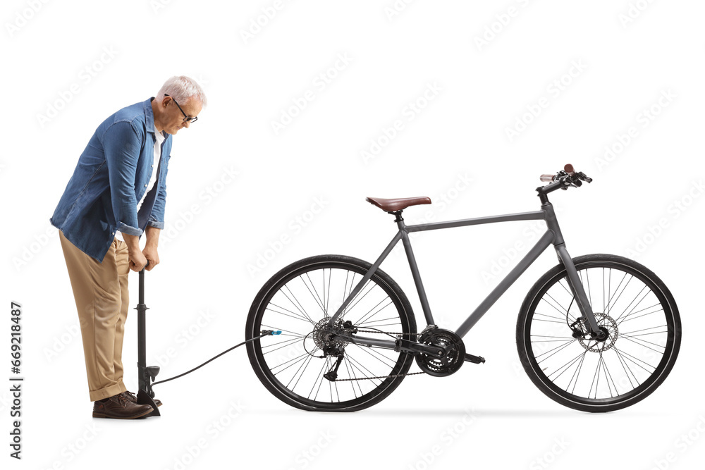 Mature man using a manual pump for a bicycle tire