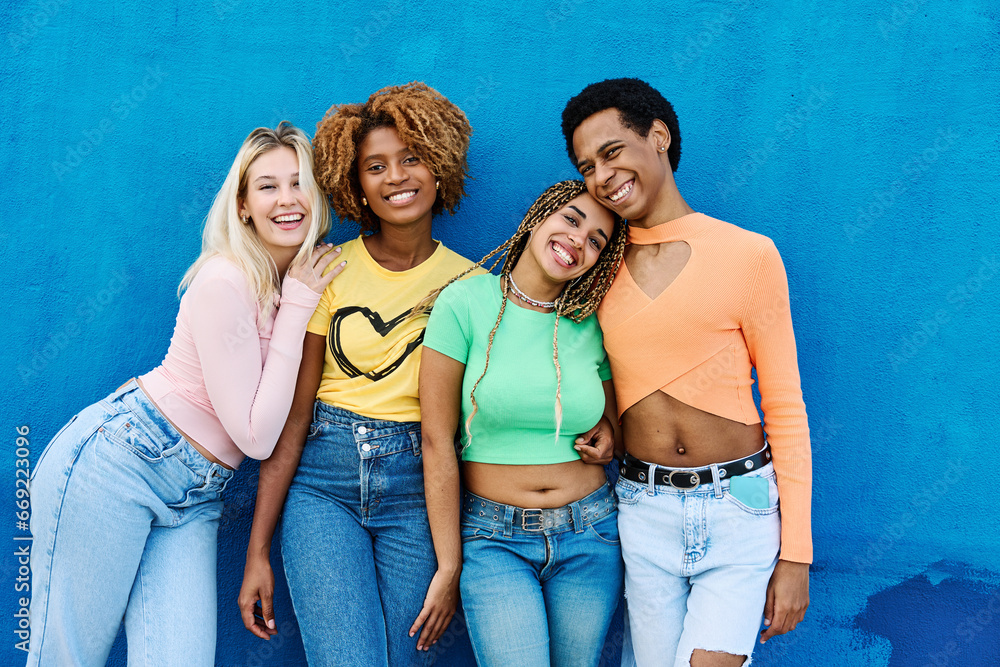 Cool young multi-ethnic and gender diverse friends posing outdoors