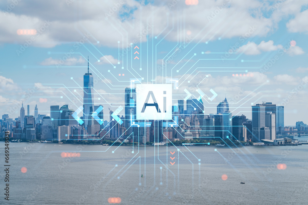 Aerial panoramic helicopter city view of Lower Manhattan and Downtown financial district, New York, USA. Artificial Intelligence concept, hologram. AI, machine learning, neural network, robotics