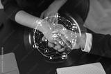 Businesspeople shake hands on great deal at office workplace. Concept of team work, business agreement, partnership, project success. Handshake shot. Social network icons.