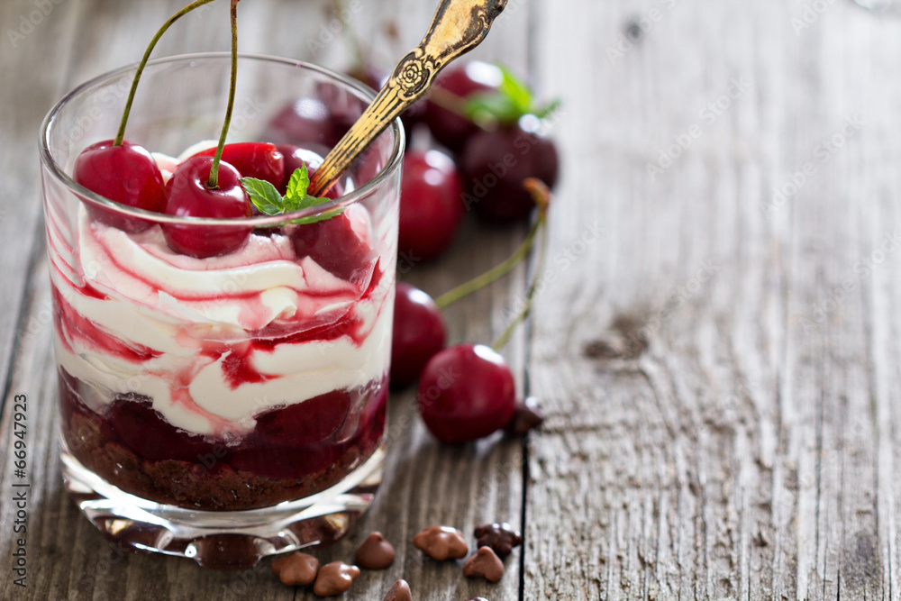 Sweet cherry cheesecake in a glass
