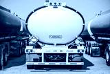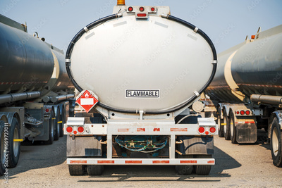 Flammable load. Gasoline transport truck with a full tank in the refinery