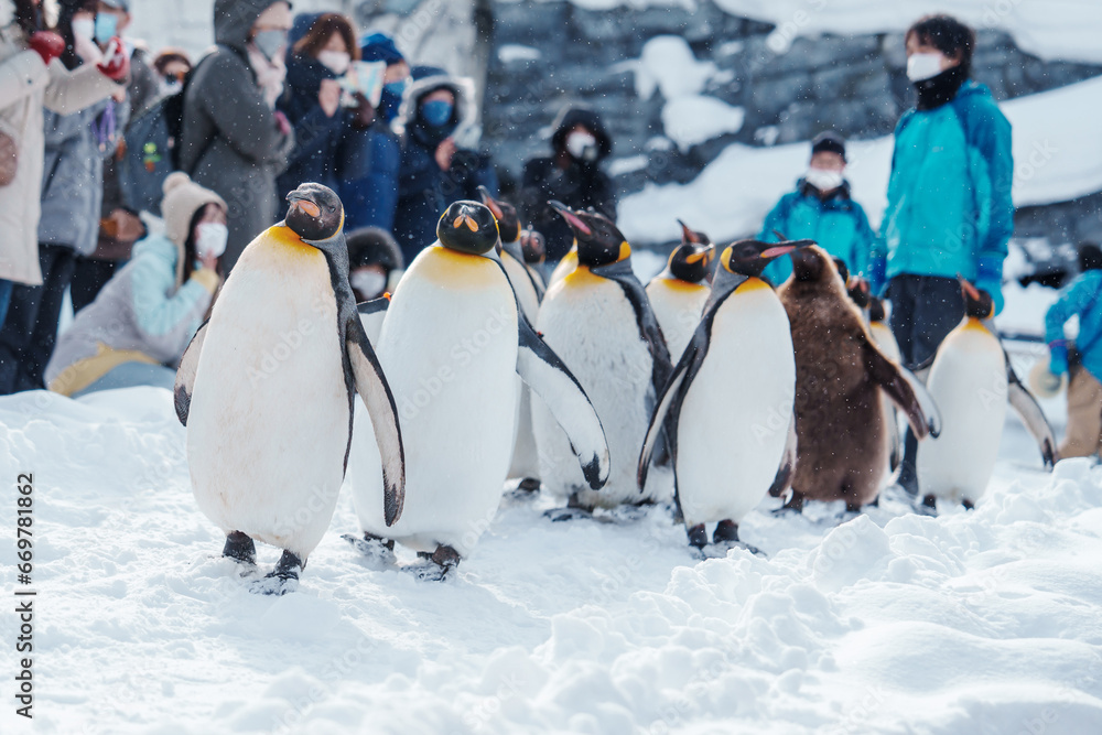 King Penguin parade walking on snow at Asahiyama Zoo in winter season. landmark and popular for tourists attractions in Asahikawa, Hokkaido, Japan. Travel and Vacation concept