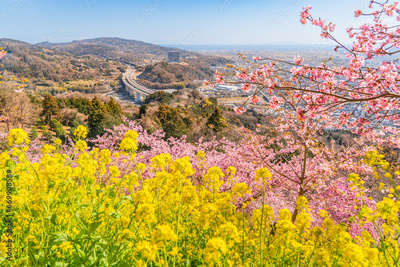松田町の春景色 丘の上から望む春の花々と麓の町並み【神奈川県】 Spring scenery of Matsuda Town - Kanagawa, Japan