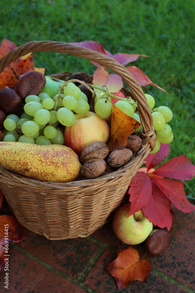 Various fresh autumnal fruits in a wicker basket with orange and yellow leaves. Grapes, apples, pear, walnuts and chestnuts against green grass background