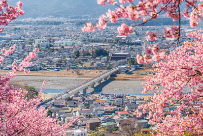 西平畑公園・松田山の春景色 河津桜越しの街並み【神奈川県・松田町-開成町】 Spring scenery of Matsuda Town - Kanagawa, Japan
