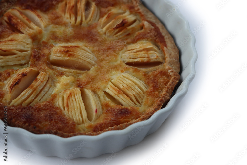 Homemade tasty apple pie with custard cream and sliced fruits isolated on white background