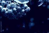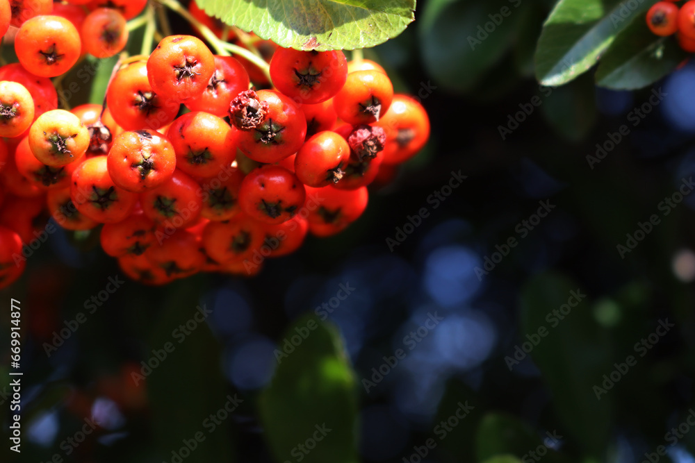 Autumnal background with copy space. Pyracantha bush with orange berries, also called Firethorn