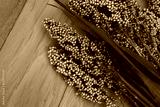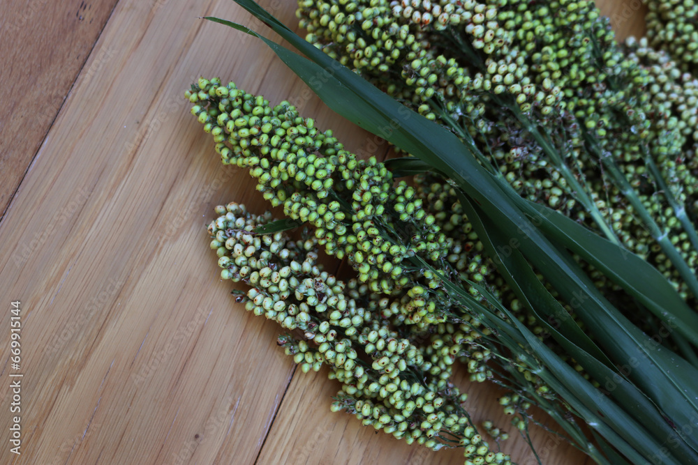 Many green harvested Sorghum plants on wooden background. Sorghum vulgare