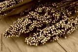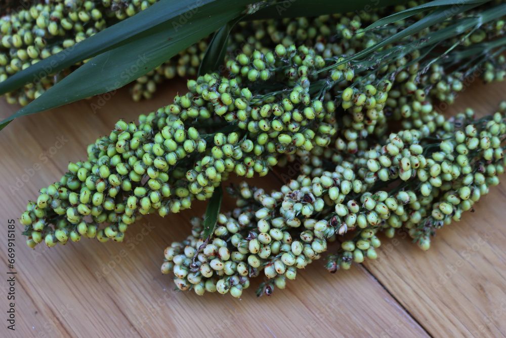 Close-up of green harvested Sorghum plants on wooden table. Sorghum vulgare