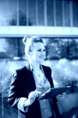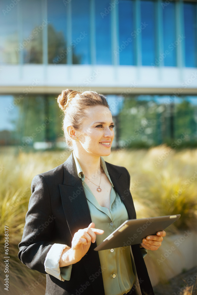 happy woman worker in business district using tablet PC