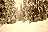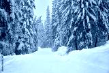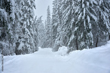 Winter forest road covered by snow during the snowfall.