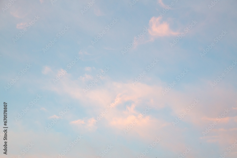 Blue sky with pink sunset clouds. Cloud texture, background.