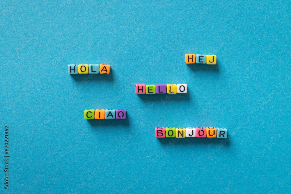 hello hola ciao bonjour, say hi in different languages, learn foreign language concept on blue, polyglot