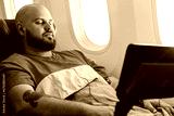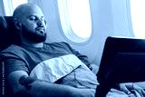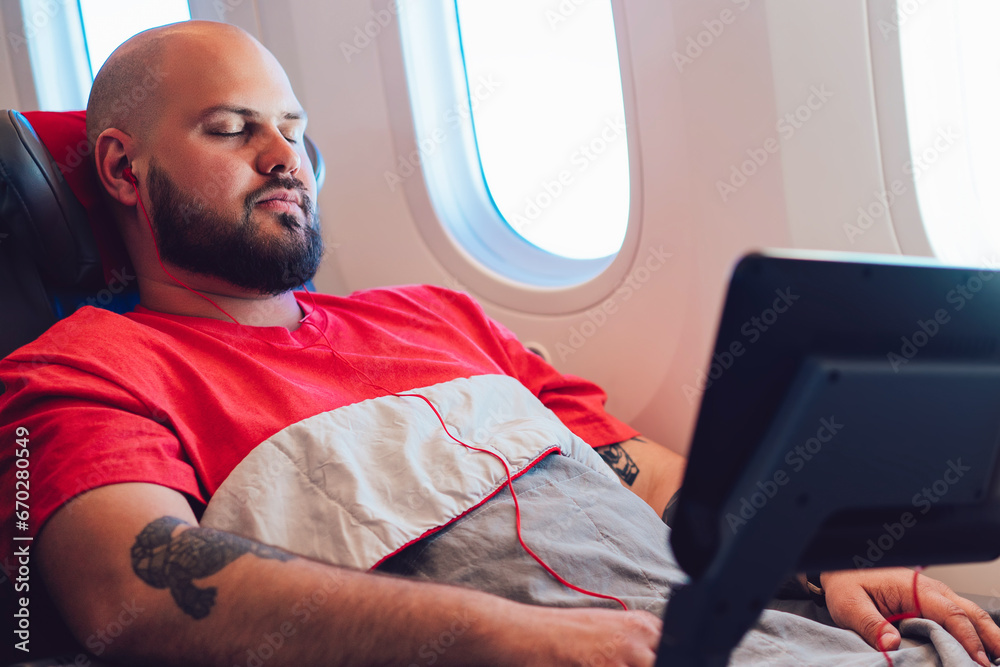 30 years old Caucasian man sleeping on wide seat cowered with blanket during business class flight time