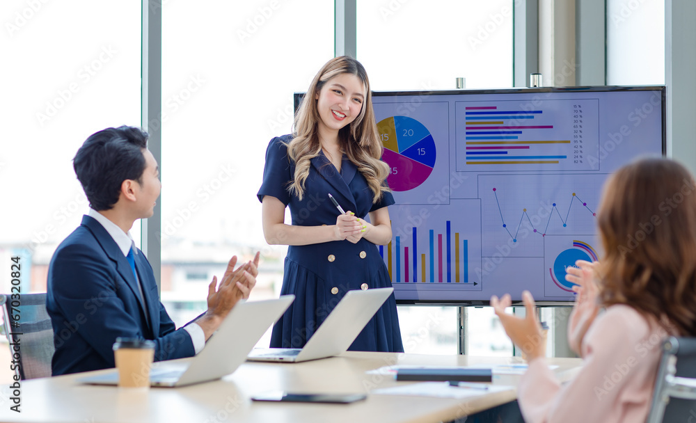 Asian professional successful female businesswoman presenter lecturer speaker in formal business outfit stand hold pen pointing presenting graph chart strategy data on computer screen in meeting room
