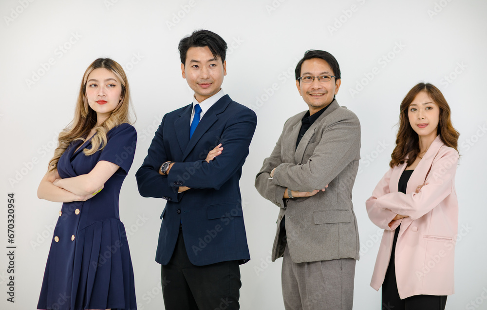 Asian professional successful male female businessmen businesswomen management in formal business suit standing side by side posing taking photo together on white background.