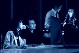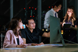 Asian professional skilled male programmer helping fixing and explaining computer problems for businesswoman employee working night shift overtime with male female businessman colleagues in office