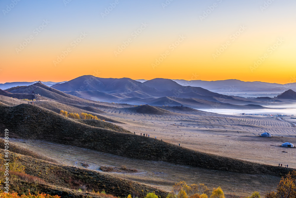 Beautiful mountain natural landscape at sunrise in Inner Mongolia, China. Grassland scenery in autumn season.