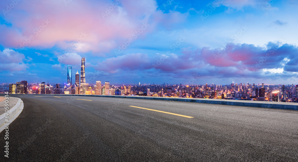 Asphalt highway road and city skyline with skyscraper at night in Shanghai, China. High Angle view.