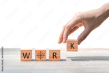 Place wooden cube with "work" text isolated on white background. Business ideas to goals.PNG