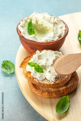 Sandwiches with tasty cream cheese and fresh basil leaves. Food recipe background. Close up