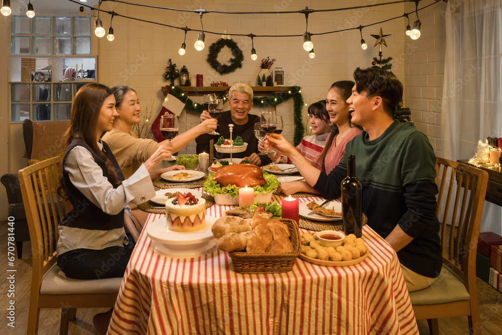 happiness Asian family with multi generation together on thanksgiving and Christmas celebration traditional dinner at home