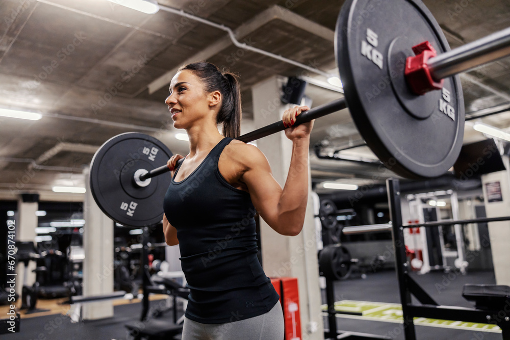 A happy strong woman is lifting barbell in a gym and doing exercises for shoulders.