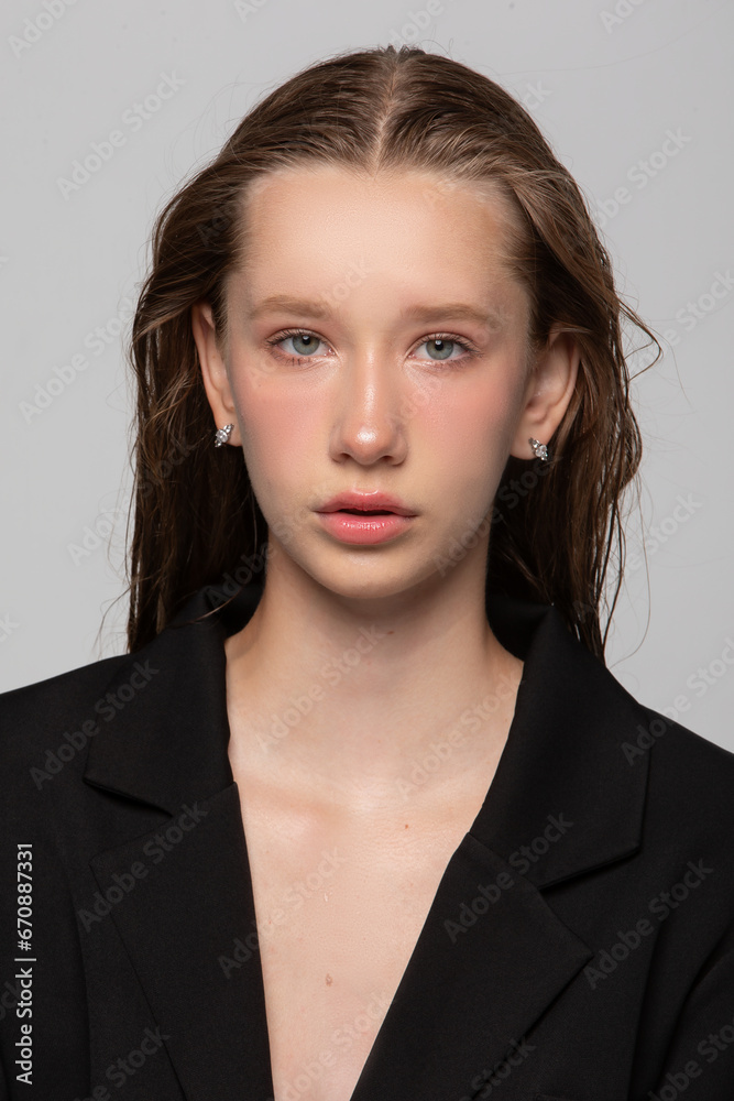 Portrait of a beautiful blonde girl with blue eyes and clear skin. A seventeen year old girl. Slavic appearance of a young beauty.