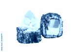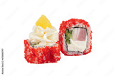Cheap version of sushi rolls on a white background. Japanese food made from rice and artificial red caviar, eel and Philadelphia cheese.