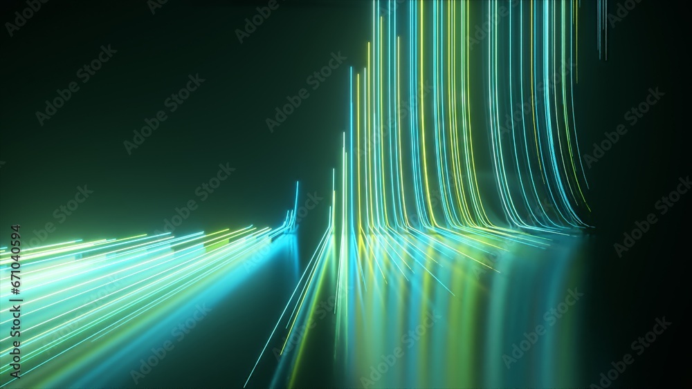 Abstract black background with green blue neon lines go up and disappear. 3d illustration